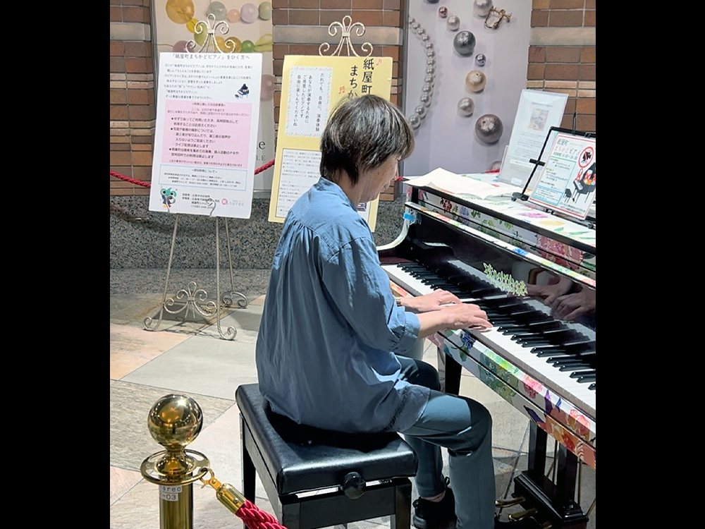 4月に夫婦で広島旅行に行きました。テレビで放送された紙屋町の街角ピアノを弾きたくて立ち寄りました。お客様はいなかったけど、お気に入りの3曲を気持ちよく弾かせてもらい満足です。夫が撮影してくれました。感謝です。