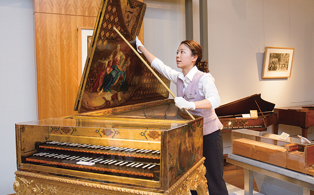展示室の楽器の維持・管理も学芸員が担う仕事のひとつだ。毎日、展示室を見回りながら、楽器の向きや状態をチェックする。