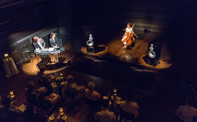 イベントの後半ではなんと、新倉さんがチェロを持って舞台に上がりました。NS-5000と新倉さんの演奏を聴き比べるという、びっくり仰天の試みです。まずはNS-5000で彼女にとって思い出深い『鳥の歌』(カタロニア民謡/カザルス編曲)を試聴。舞台上に座っている新倉さんは音楽を聴きながらゆらゆらと体を動かし、すでに音楽に入り込んでいる様子。続いて、いよいよご本人の演奏です。コンサートホールよりもぐっと近い距離で聴く等身大のチェロの調べはまさに極上でした。