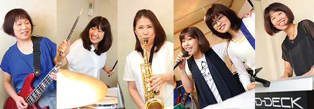 「バンドは不良と言われた時代、ましてや女子だけのバンドなんてなかった中学生のころから、女子バンドを組みたかった」というリーダーの河原さんが、長年の夢を実現すべくドラムを習い、2007年に結成。メンバーは、河原さんがエレクトーン講師をしていたころの教え子の母親や、そのママ友だちなどで、全員バンド経験ゼロだった。結成当時からのメンバーである平野さんは「サックスが吹けたらカッコいいんじゃない?って誘われて」、バンド結成を機にサクソフォンを始めた。「10年間コツコツ頑張れば、それなりになる。続けるって大事ですね」(平野さん)