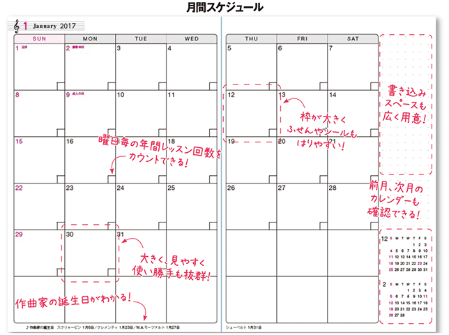 さらにはこんなアイデアも。「実現できるかできないかは別として、私は翌年の適当な日に予定を入れてしまいます。『自分との約束』ですね。すると、それが実現したりするのです。日々のすべてを自身で管理しなければならないピアノの先生にとって、時間をコントロールするという意識はとても大事です。この手帳が、ご自身で未来を切り拓くきっかけになれるとしたら、とても嬉しく思います」