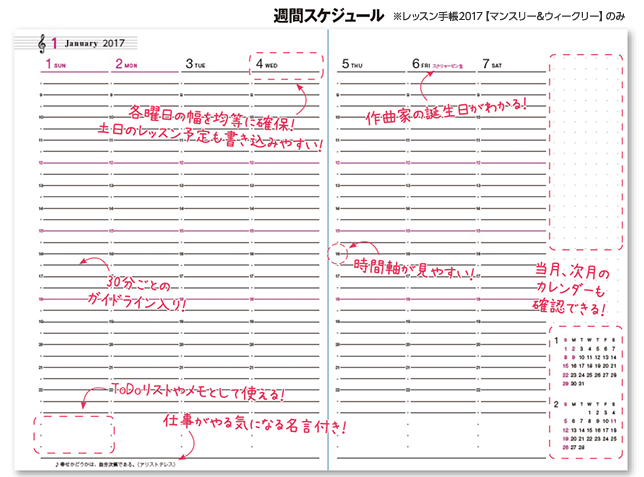 『レッスン手帳2017』には、「マンスリー&ウィークリー」版と薄型で持ち運びに便利な「マンスリー」版の2種類があり、表紙は音楽モチーフを織り込んだボーダー柄、花柄のリバーシブル。2017年版はさらに、表紙の別デザイン4絵柄がダウンロード可能となり、着せ替えられる楽しさが加わった。