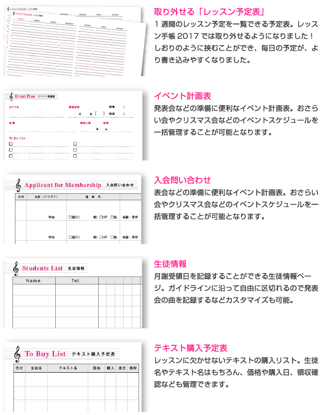 進化のポイントはまだある。一週間の予定を30分ごとに管理できる「レッスン予定表」が取り外せるようになり、利便性が高まった。また、発表会などのイベントに向けたスケジュールを書き込む「イベント計画表」が本番4か月前からに拡張され、入会の問合せを記録する「入会問合せ」欄の新設など、愛用者だからこそわかる細かい点がさらに充実した。発表会での演奏曲なども記録できる「生徒情報」欄や「テキスト購入予定表」など、教室運営に欠かせない項目を網羅している。