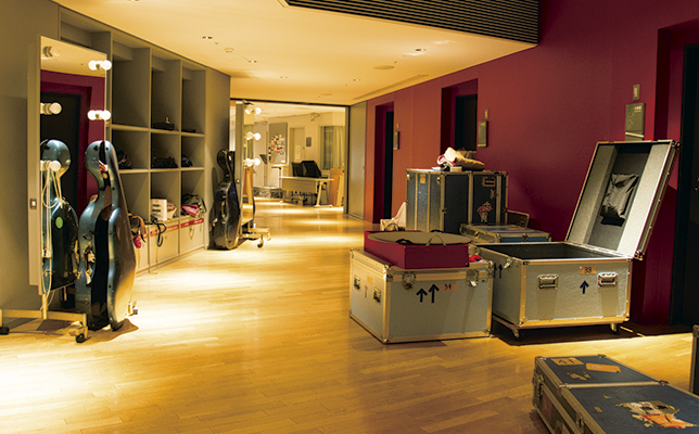 東京交響楽団のメインホールであるミューザ川崎シンフォニーホールの舞台裏。ホールでリハーサル中のため、楽器ケースがそこかしこに置かれていた。