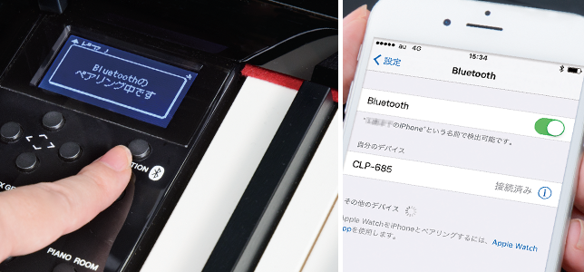 さらに、今回のモデルチェンジにより、Bluetooth®(CLP-645/675/685に搭載)で楽器本体とスマートフォン(スマホ)やタブレットを接続すれば、オーディオデータを楽器本体のスピーカーから再生できるようになりました。
