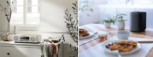 デスクトップオーディオでは、高音質Bluetooth再生も可能なミニコンポ「TSX-B235」(写真下左)が大人気。抜群のデザイン性とCDやラジオなども楽しめる実用性が大ヒットの秘密です。Wi-Fi機能も内蔵したワイヤレススピーカー「WX-010」(写真下右)は、小型のころんとしたフォルムがかわいらしく、キッチンなどに置くのもおすすめです。