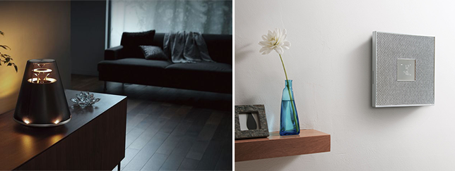 たとえば、ヤマハのインテリアオーディオ。Bluetoothスピーカーと照明器具がひとつになった「Relitシリーズ」(写真下左)は、360度広がる音楽と灯りが部屋を満たしてくれます。まるでアートフレームのような「Restio」(写真下右)は、絵や写真のように据え置きにしたり、壁掛けにしたり。空気のように広がるサウンドは日常生活に潤いを与えるBGMとしても最適で、リビングに置くにはぴったり。
