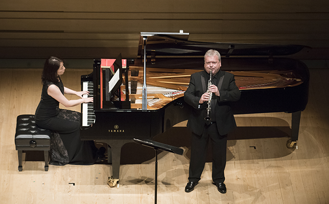 まず、1曲目は、ロヴレーリョの《ヴェルディの歌劇「椿姫」の主題による協奏的幻想曲》。ピアノを伴奏に、クラリネットがアリアのテーマを伸びやかにうたったのち、技巧を最大限に極めながら展開していく。器楽らしいこの華やかな展開で、楽器のカリスマ性とコリンズ自身の卓抜した技量が、空間すべてを圧倒する。思いがけず一気に熱の高まった場内は、ここからドラマティックな時間を過ごすことになる。