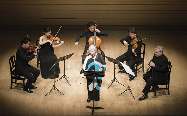 2曲目は、モーツァルトの《クラリネット、ヴィオラ、ピアノのための三重奏曲》。ここで静かな室内楽の雰囲気がゆるやかに浸透しはじめるかと思いきや、ソプラノのロスチャイルドが登場すると、その流れは勢いよく方向を変えていく。《夏の思い出》《からたちの花》《赤とんぼ》《たあんきぽーんき》の日本歌曲がクラリネットと弦楽四重奏の伴奏で、次いで、シューベルトとシュトラウスの歌曲がクラリネットとピアノの伴奏で歌われる。ロスチャイルドの明るい質量のある歌声は、その第一声で場内の空気をがらりと変える。まるで薄くただよう靄をふり払うように、言葉と旋律を、音楽の語る言葉を、より強く耳に伝えてくるのだ。歌に寄り添って旋律を奏でるクラリネットは、歌とほかの楽器をつなぐ中間的存在となりながら、ここにおいて本物の歌声との対比を示すことになる。