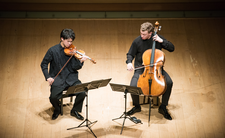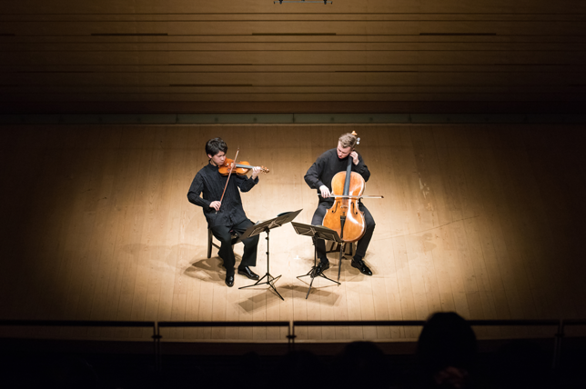 続く、コダーイの二重奏曲では、ハンガリー音階を生かしたメランコリックな旋律に、ぐいぐい引き込まれていった。バイオリンのハイトーンがゆらぎを醸し、チェロの力強い低音やロングトーンがうなり、独特の響きで場内を満たした。