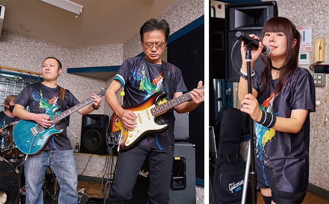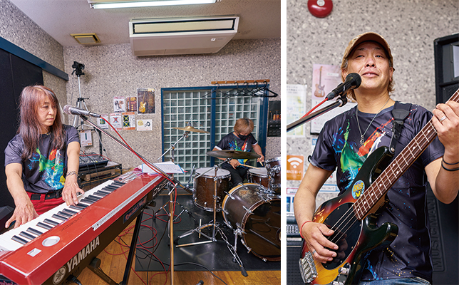 (写真左)作曲やアレンジでバンドを支える本田さん(左)と齋藤さん(右)。本田さんはエレクトーン講師の資格を保有。愛用の「STAGEA D-DECK」は、カラーを赤にカスタマイズ。ライブ会場で「珍しい」と注目されることもあるそう。(写真右)リーダーの稲田さんはバンド歴20年以上。それだけに顔も広い。