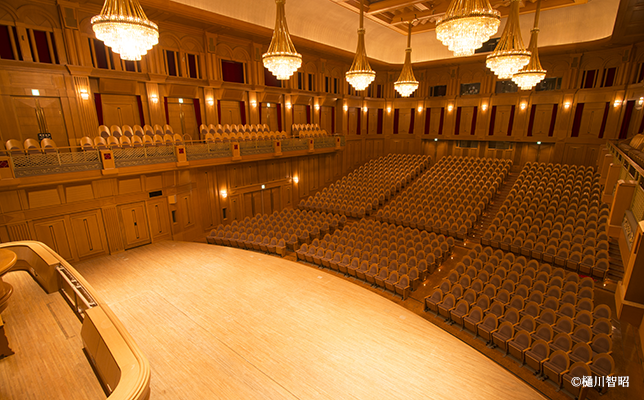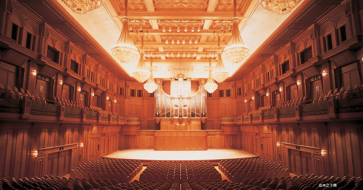 扉を開いてシューボックス型ホールの中に足を踏み入れると、何ともいえない品位とゴージャス感が漂う空間が出迎えてくれる。落ち着いた木の雰囲気がもたらす独特の静けさがあり、天井から下がる8基のシャンデリアが高級感を演出。正面に据えられたパイプオルガンが揺るぎのない誇りを表しているかのようだ。