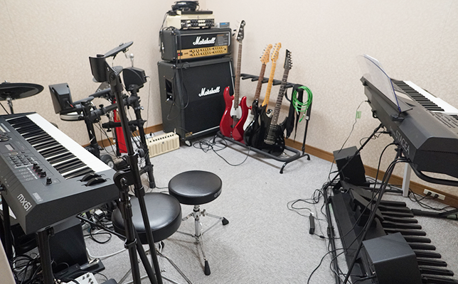 バンド練習が行われる部屋には、エレクトーン、シンセサイザー、ギター、ベース、電子ドラムなどが。