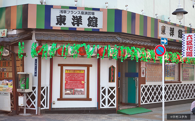 いろもの(漫才、漫談、コント、マジック、曲芸、ものまね、紙切りなど)寄席として営業する「浅草フランス座演芸場 東洋館」。同じ建物の浅草演芸ホールとともに、現在の浅草公園六区の象徴的存在。