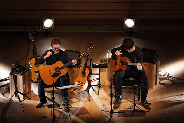 後半のステージを担当したのは、渡辺香津美と押尾コータローのデュオ。1曲目の「UNICORN」から渡辺は流れるように弾きまくり、押尾はタッピングやスラッピングを駆使して、ふたりだけで演奏しているとは思えない重厚なサウンドを響かせる。Y.M.Oのサポートを務めたことのある渡辺が坂本龍一の「Merry Christmas Mr. Lawrence」を奏で、さまざまな楽器が代わる代わる登場するラベルの「ボレロ」を2本のギターだけで巧みに聴かせるなど、テクニック、選曲、演出すべてにギターファンを喜ばせる要素が詰め込まれている。そのうえふたりはトークにも長けていて、厳かなヤマハホールは、ギターの響きに負けないくらいの(?)笑い声に包まれた。
