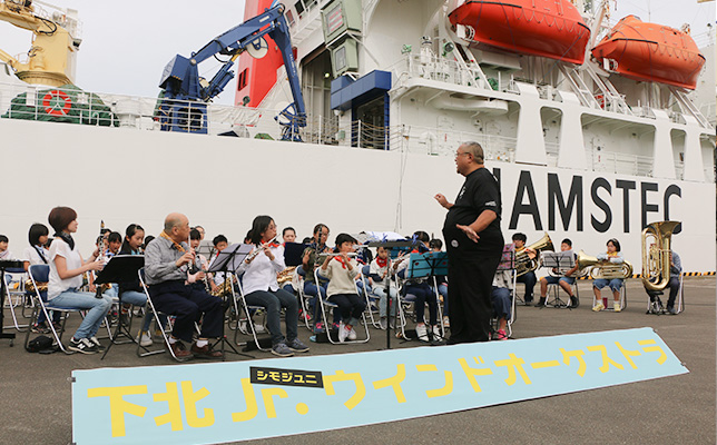 JAMSTEC(海洋研究開発機構)一般公開のオープニングセレモニーで演奏。後ろに見えるのは、海洋地球研究船「みらい」。