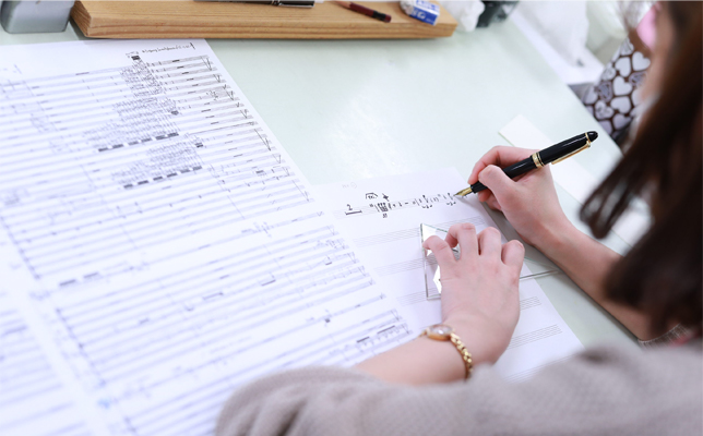 「学生の頃の夢は“音楽に関わる仕事に就きたい”でした。歌手や奏者になりたかったわけではなく、漠然と大好きな音楽に関わっていたいと思っていたんです。なので今、すばらしい音楽を作る人、演奏する人とともに、仲間になって音楽を生み出すお手伝いができているのは大変うれしいですし、それが写譜の仕事において大きなやりがいだと感じています」