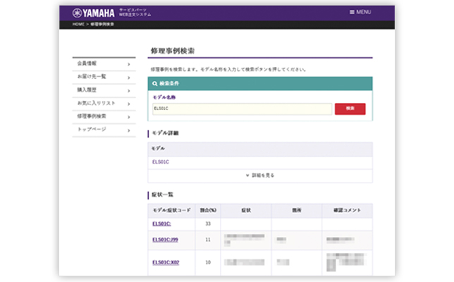 画期的なのは、「アフターサービス業務管理システム(Compass)」に蓄積された修理事例から、モデル名と症状をキーにして修理事例を検索・参照し、そのままパーツオーダーが可能になった点。先人たち(ヤマハ修理技術者)が行った修理の統計情報を見ることができ、それぞれのケースで使われたパーツが表示され、その画面からそのまま注文できるようになったのです。