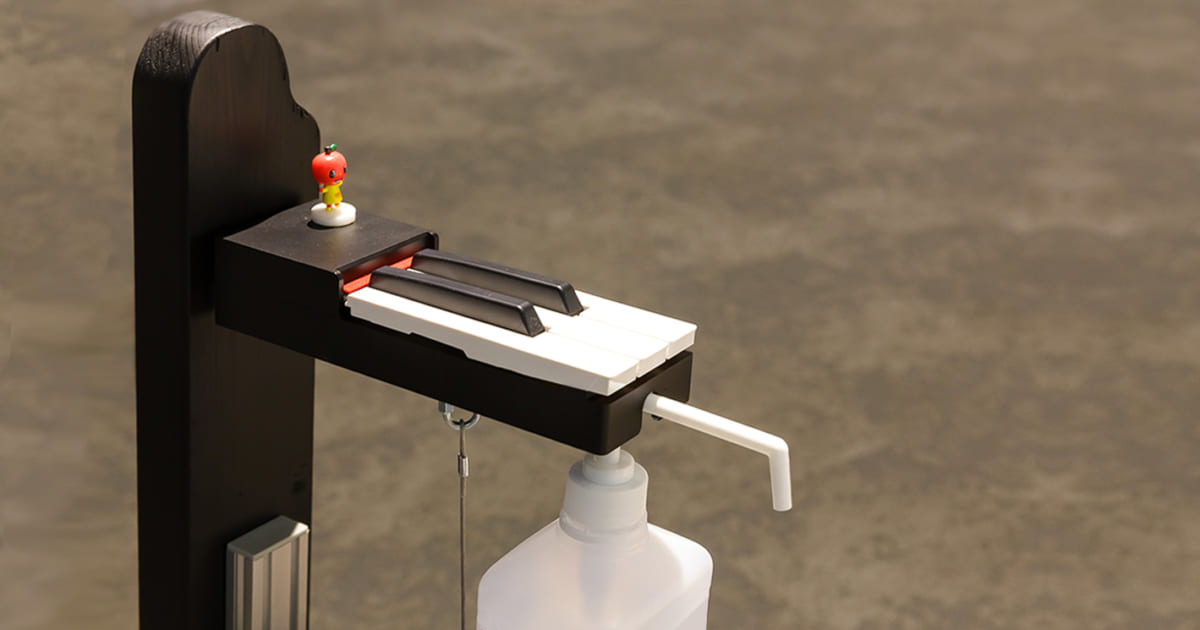 ヤマハの代名詞ともいえるピアノをモチーフに作られたこのスタンドは、下部に設置されたペダルを踏んでも、上部の鍵盤を肘などで押してもシュッと消毒液が出てくるしくみ。鍵盤のそばには、ヤマハ音楽教室のキャラクターとしておなじみの「ぷっぷる」がちょこんと乗っていて微笑ましい。