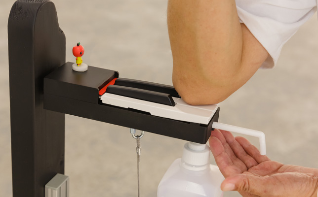 手や指ではなく、肘で押せるのが特徴。子どもでも届くよう高さ90センチに設置。
