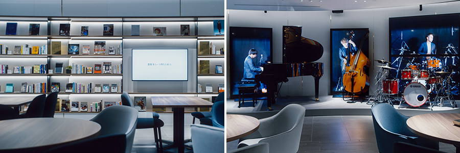 カフェラウンジに併設の「ライブラリー」は、好奇心や感性を刺激する音・音楽にまつわる約700冊の本を揃え、食事やドリンクを楽しみながらの閲覧が可能。