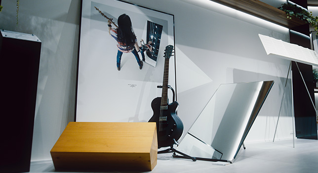 2階では、「Design Exhibition」(デザインエキシビジョン)もお見逃しなく。現在は、「音楽と人とそのあいだ」をテーマにした譜面台や演奏シーンが確認できる鏡などのプロトタイプを展示。本質を押さえ、シンプルながら革新的なヤマハのデザインフィロソフィーが感じられるに違いない。