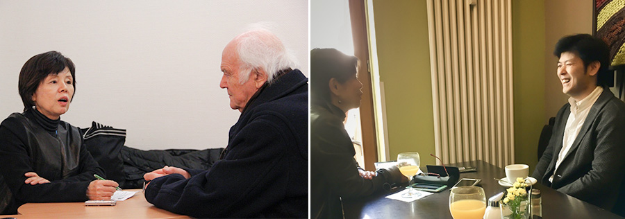 写真左:ミシェル・コルボ(スイスの指揮者)インタビュー、フランスのナントにて。写真右:樫本大進(ベルリン・フィルのコンサートマスター)インタビュー、ベルリンにて。※写真は伊熊よし子さんご提供