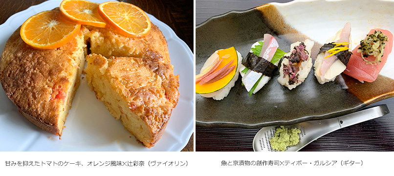 写真左は、辻彩奈の音楽と同様に男性にも女性にも愛されるケーキ。小さなパーティの場で薄めにスライスして出すと、みんなの手が伸びる。 写真右は、世界中の人々から好まれるお寿司。ディボー・ガルシアの繊細でシンプルで自然なギターの響きを、おさしみと京漬物で表現。※写真は伊熊よし子さんご提供