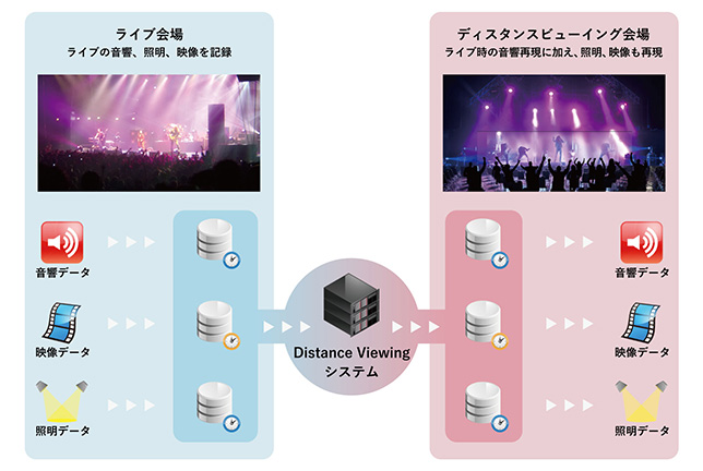 今回開発された「Distance Viewing」は、ライブ会場で収録した音響、映像、照明のデータを連携した形ですべて保存し、再現するシステム。観客はライブ会場に足を運び、ステージ上に完全再現されたパフォーマンスを楽しむことになる。臨場感やステージと観客の一体感など通常のオンライン配信では感じにくい、ライブ会場ならではの醍醐味が味わえるのが最大の特徴だ。