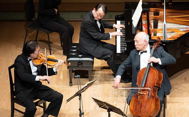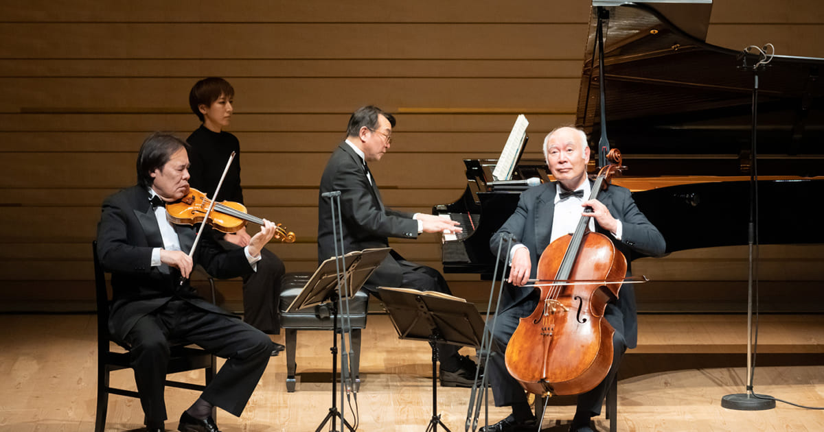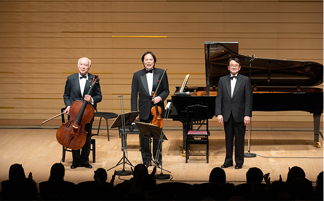 この日のコンサートは先述の通り、日本の演奏シーンを支えてきたベテラン奏者3人によるピアノ・トリオの夕べ。このピアノ三重奏というのは、“聴こえかた”の点で少し変わった編成だ。バイオリンの音は舞台から直接、聴き手の耳に届く。チェロの音は会場の両翼を回り込んで、ハグするかのように客席を包む。ピアノの音はステージから放物線を描くように放たれ、少し上のほうから降ってくるように聴こえてくる。空間の使いかたが三者三様なのだ。