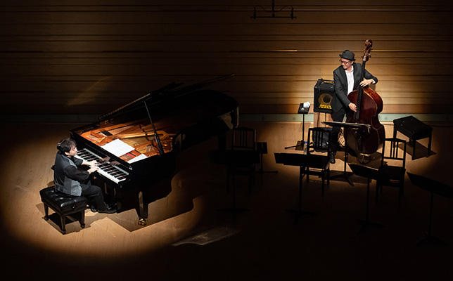 また『Spanish Waltz』をはじめ、どの曲も旋律のバトンタッチのバリエーションが豊か。唯一のデュオタイムでは、ジャズベースをピックで奏でるスティーブ・スワローの曲『Ladies in Mercedes』を、塩谷のピアノと井上のベースがゆったりと思いを交わし、ジャズのメロウなムードが場内に充満。なんだかバーに来た感じで、一杯飲みたい気分に。