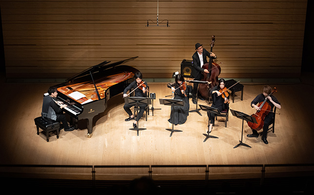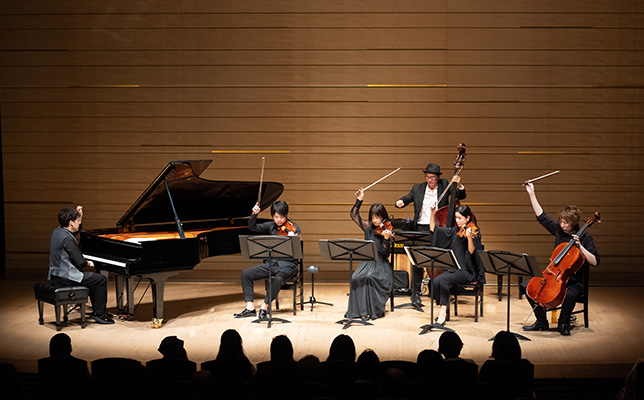 1曲目の『Wishing Well』は、カルテットの高音弦のビブラートが共鳴し合い、ベースの柔和な旋律が加わって、ピアノとともにロマンチックなストーリーを紡いでいく。ストリングス・ライブの始まりにピッタリだ。弾き終えると塩谷が「この大変な時期に意を決して来てくださってありがとうございます」とにこやかにあいさつ。