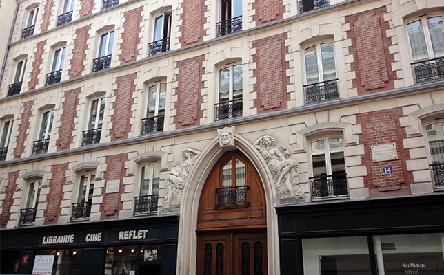 パリのオデオン広場から斜め右前方のカシミール通りを経て、ムッシュー・ル・プランス通りを右に折れた右側の14番地には、サン=サーンスが1877年から89年まで住んだアバルトマンが赤レンガ造りの威風堂々たる姿を見せている。この4階の左半分がサン=サーンスの住まいで、入口には3人の女人像の浮き彫りが見られる。