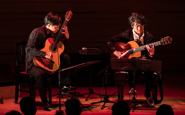 『火祭りの踊り』などファリャの3曲は、正統的ながらも熱量の多い二重奏だ。ロドリーゴの『アランフェス協奏曲』第2楽章は、フラメンコのブレリアのリズムを取り入れた沖の編曲で、哀愁と幻想の度合いが増した。締めのデュオは沖の自作『タンゴ・アン・スカイ』。すさまじい速弾きによる憂愁の調べが胸に突き刺さる。