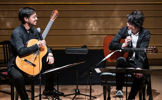 カナダ留学時に「クラシックギターのつもりでフラメンコギターを買ってしまった」。それがアンダルシアでの修業につながったが、「今もクラシックギターは好き」だ。後半の大萩との共演は、沖の幅広い音楽性を示した。まずは定番「禁じられた遊び」を沖の編曲で弾いた。単純な短調の曲が、超絶技巧を織り込んだ変奏曲となり、両ギターの音色の違いと相まってスリリングに展開する。