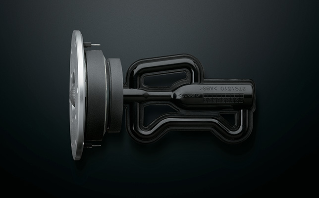 ひとつは、ユニット背面に発生する不要な音を抑えるために新開発した「R.S.チャンバー」。独自の音響解析に基づいて配置した複雑な形状のチャンバーが共鳴を打ち消し、フラットな周波数特性を実現。楽器や声の細やかなニュアンスまでも表現する。