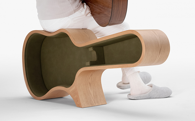 一方、曲線と直線がなめらかに連続してギターのフォルムを織りなすベンチが「classic」。そこに座る演奏者の心を温かくしてくれる上質で心地よい質感とともに、ギターの居心地がよさそうなデザインを目指した。ネックの周囲に適度な間を設け、内側にはソフトなレザー風のクッションをしつらえるなど、まるで愛するペットの寝床のよう。
