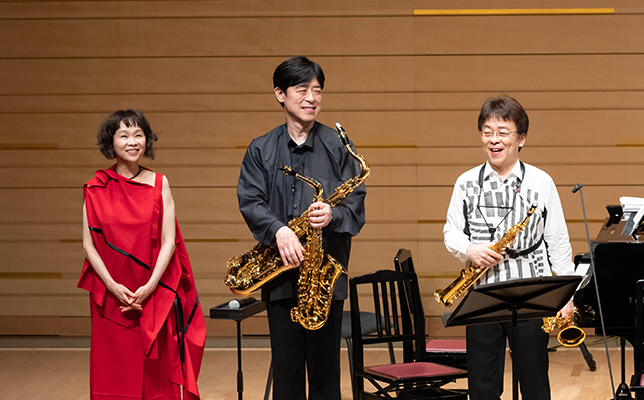 サクソフォンは比較的新しい楽器だ。1840年代にベルギーの楽器製作者アドルフ・サックスが発明し、改良・進化に伴い20世紀前半に開花した。グラズノフの『サクソフォン四重奏曲』は弦楽四重奏に匹敵するこの楽器群の表現力を示す。バイオリン、ビオラ、チェロの音域に相当するサクソフォンがそろっているのだ。須川はソプラノとアルトとバリトン、田中はアルトとテナーとバリトンの各サクソフォンを使用し、小柳のピアノも交えて多彩なアンサンブルを聴かせた。