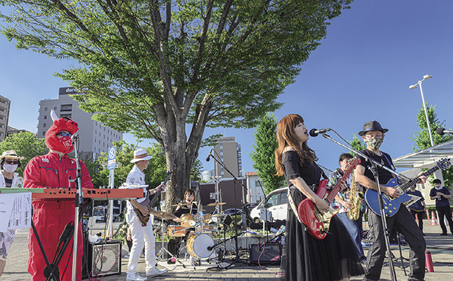 2021年7月17日に開催された路上ライブイベント「駅おん♪」で演奏するAssort Beat。梅雨明け直後の晴天下、サポートメンバーとともに盛り上がった。