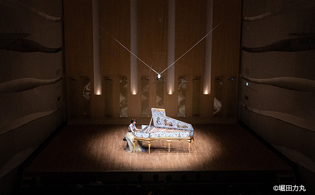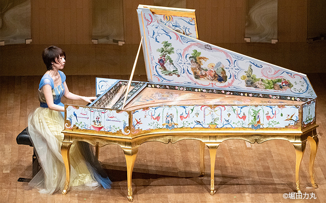 このチェンバロは18世紀フレンチ・モデルで、ドイツ作品を演奏するのにも適しており、美しい白のボディに装飾が施されている。