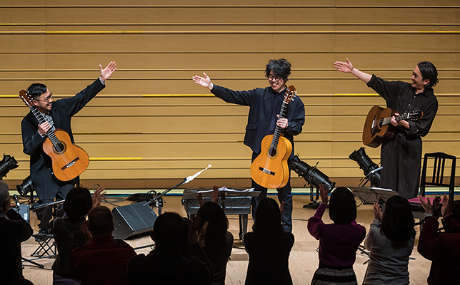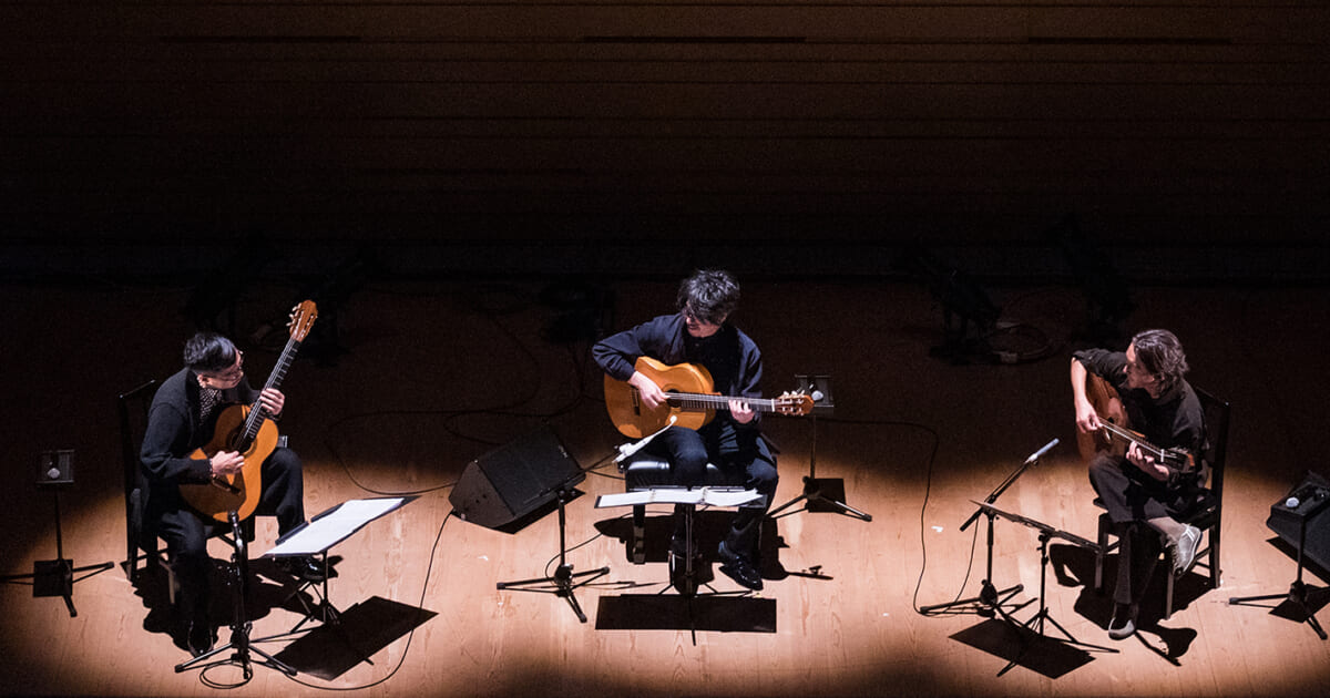 フラメンコギター奏者・沖仁、クラシックギター奏者・大萩康司、ジャズギター奏者・小沼ようすけ、人気の3名手が集まって、ソロ、デュオ、トリオを披露した。スペイン語で「3」を意味する「TRES(トレス)」と題する演奏会。