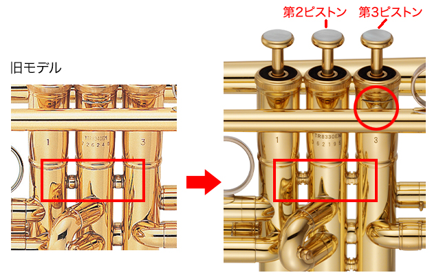 ピストンバルブ同士をつなぐ支柱の形状を変え(赤い枠の部分)、本体とつなぐ支柱を第2ピストンから第3ピストンに移動することで、効率的に楽器を鳴らす最適な抵抗感を実現。
