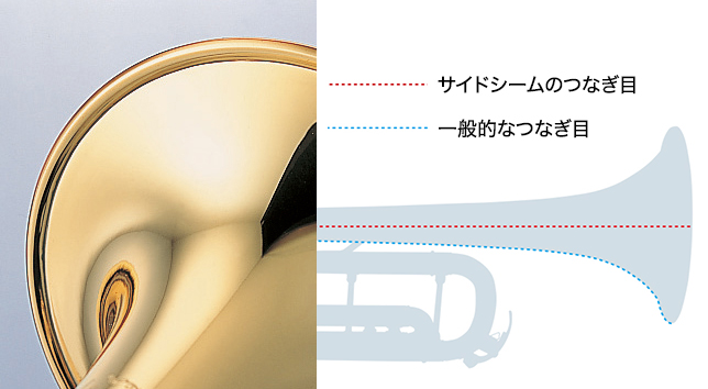 YTR-8330EM(第2世代)のベルの工法は、第 1世代から継承されているもの。 (写真左)縁をかまぼこ型に巻き、奏者への音のフィードバックを良くするフレンチビードは、職人の高い技術を要する。(写真右)つなぎ目を横側にし、楽器をより振動させるサイドシームを採用。
