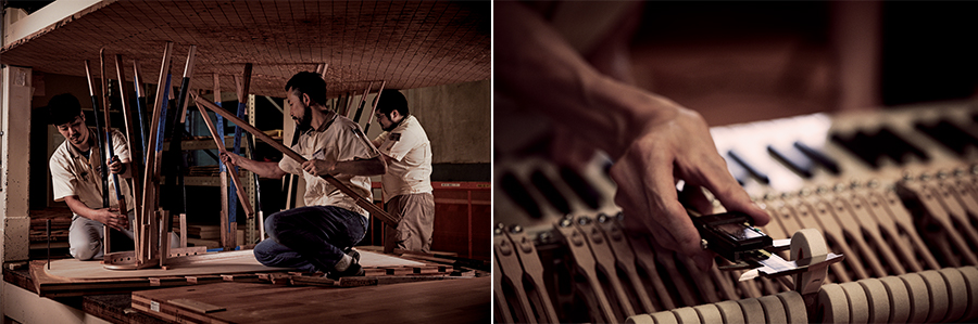 (写真左)駒を響板に接着する工程は、手間のかかる伝統的な工法をあえて採用。絶妙な力加減で圧力をかけられるという。(写真右)ピアノの音色を決めるハンマー。最適な音づくりができるのは、弦を打つ羊毛フェルトの個性を見極められる特器工程の職人の腕があってこそ。