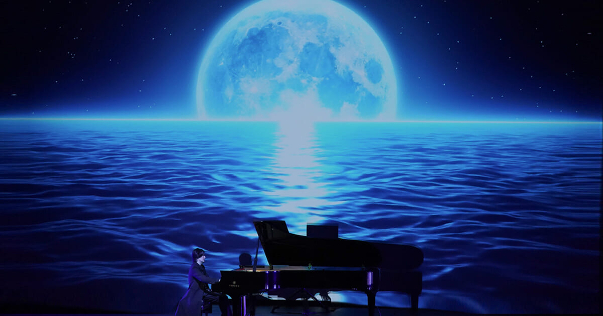 さらに、近代音楽としてドビュッシー『ベルガマスク組曲より 月の光』の演奏が始まると、クリスタルのように透明感のある優しい響きに会場中が惹き込まれる。月の光に照らされた青い海原の幽玄な映像が音楽と融合し、心に深く染み入るパフォーマンスとなった。