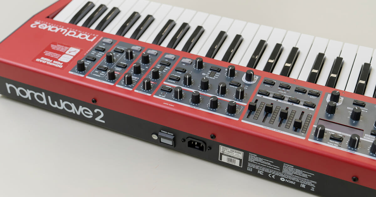 nord(ノード)のステージピアノの背面。電気用品安全法の基準をクリアした証であるPSEマークと、輸入事業社名(ヤマハミュージックジャパン)を記したシールが貼られている。