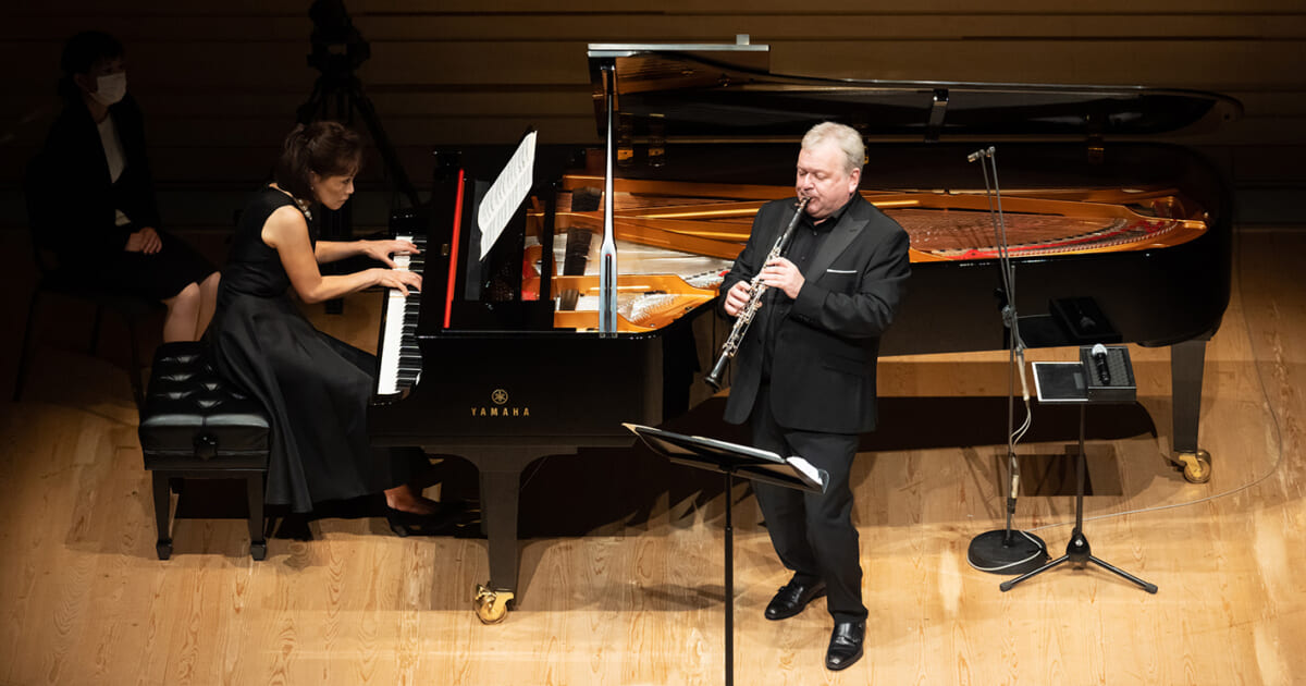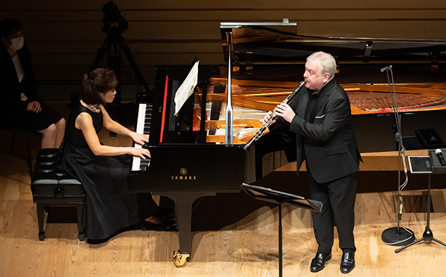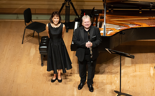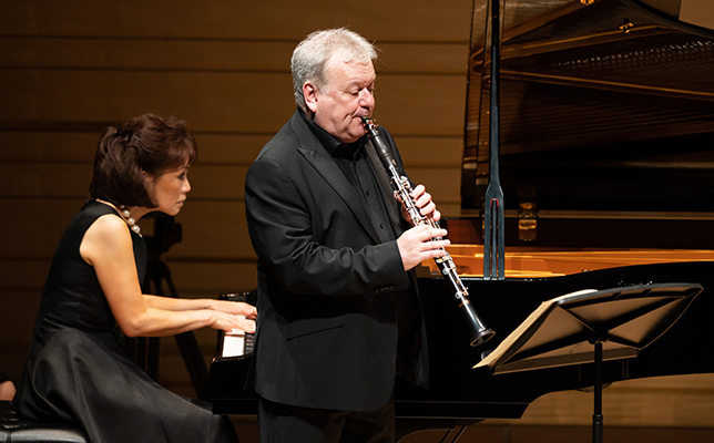 フィルハーモニア管弦楽団で長らく首席クラリネット奏者を務め、現在はソロや室内楽、さらに指揮者としても活躍する巨匠マイケル・コリンズ。今回は彼の盟友で、国際派ピアニストとしてもおなじみの小川典子による豪華デュオが、2022年8月13日、ヤマハホールで実現した。