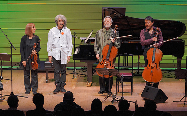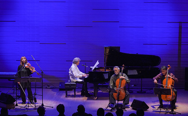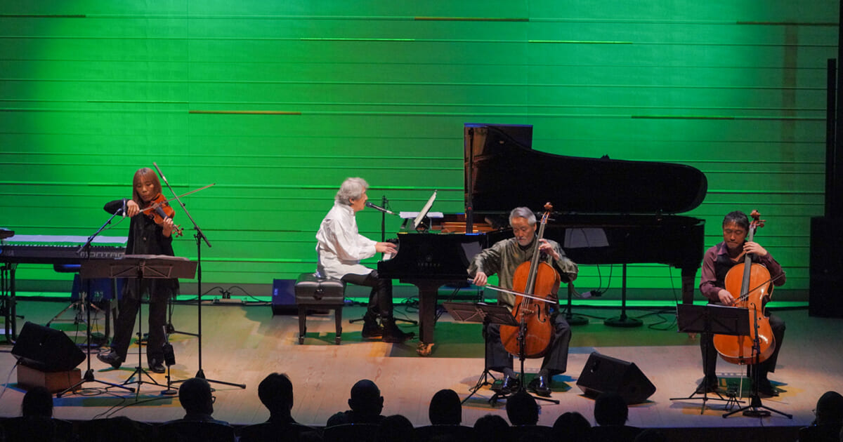 マレーと古川を迎えて披露されたキング・クリムゾンの『RED』は、キーボードの攻撃的な音色と弦のおりなす重厚な響きが、オリジナルに負けない“迫りくる”感覚を放つ。対人地雷反対の想いを歌う『X=歩幅』では、複雑な拍子で打ち鳴らされるビートのうえで、ピアノと弦がジャズ的なフレーズをユニゾンで奏でるさまが実にスリリング。まるで地雷で歩きにくくなった大地の上でも負けずに前進するぞと宣言しているかのようだ。鈴木も加わった『Klein Blue』になると一転、それぞれの楽器が美しくドラマチックに響き合い、まるで感動的な映画のワンシーンを観ているような気分になる。