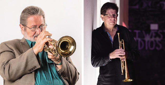 (写真左)ボビー・シューさん。世界的なジャズトランペット奏者でありフリューゲルホルン奏者。名だたるビッグバンドのリードプレイからソロまでこなす実力者であるとともに、教育者としても多くのトランペット奏者に影響を与えている。