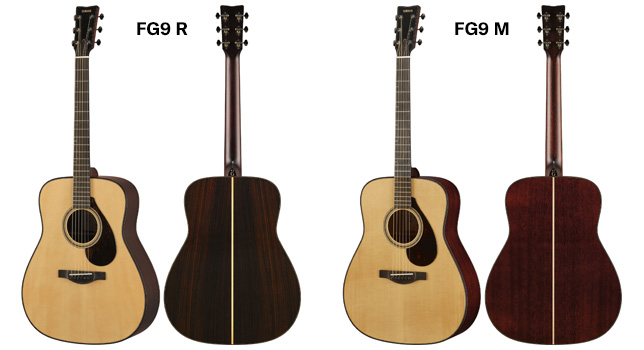 ヤマハでは初となるアディロンダックスプルースをトップ材に用い、力強さと明瞭さを備えたサウンドが特徴の「FG9」。サイドとバックにローズウッドを用いた「R」とマホガニーを採用した「M」が用意され、好みによってチョイスできる。双方は設計も異なり、材の特性を最大限に生かしたサウンドが出せるようにチューンナップされている。